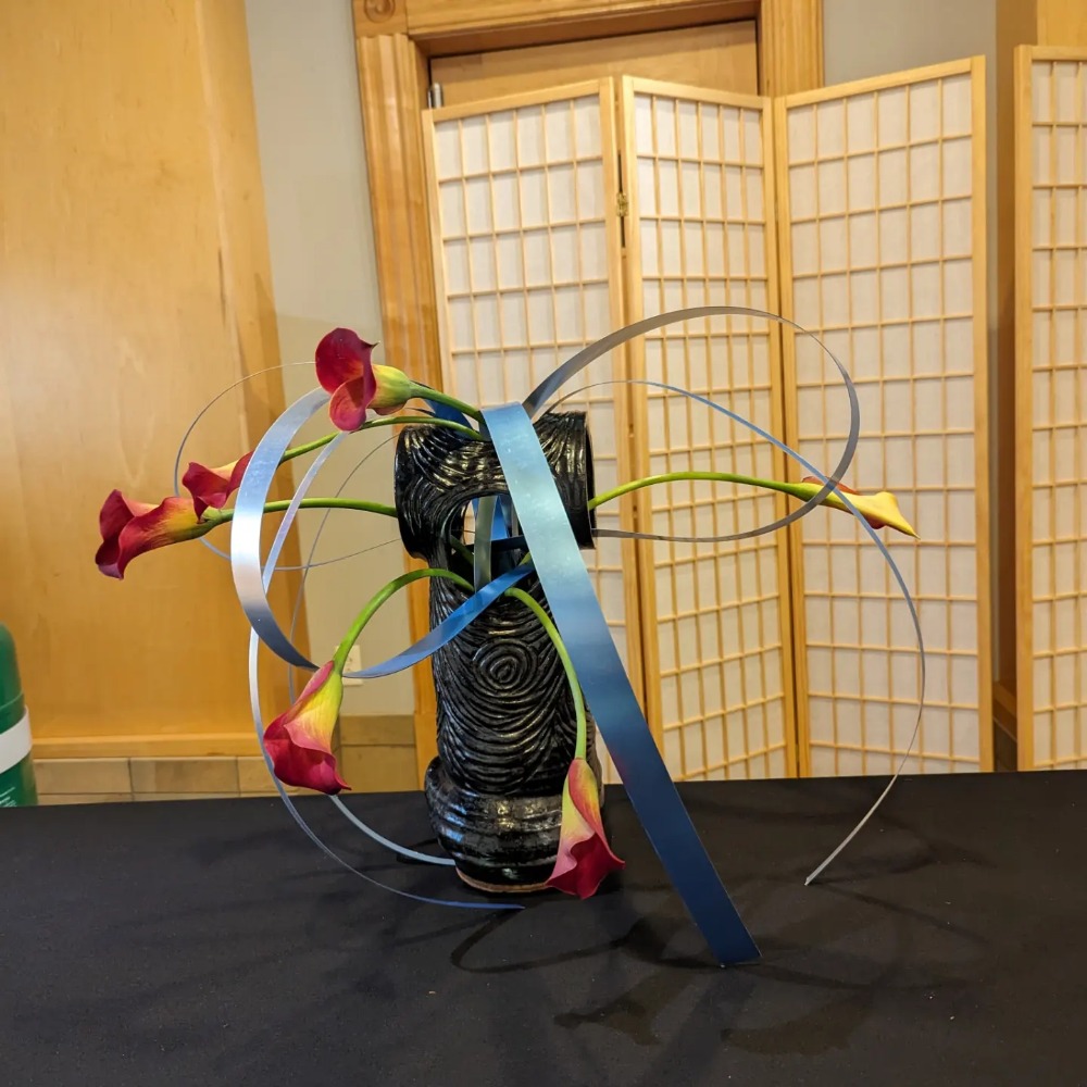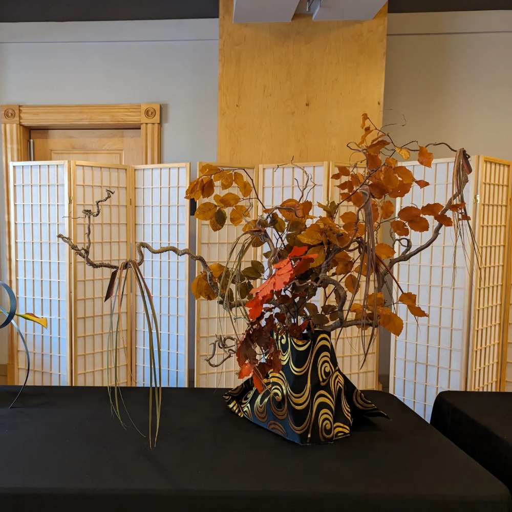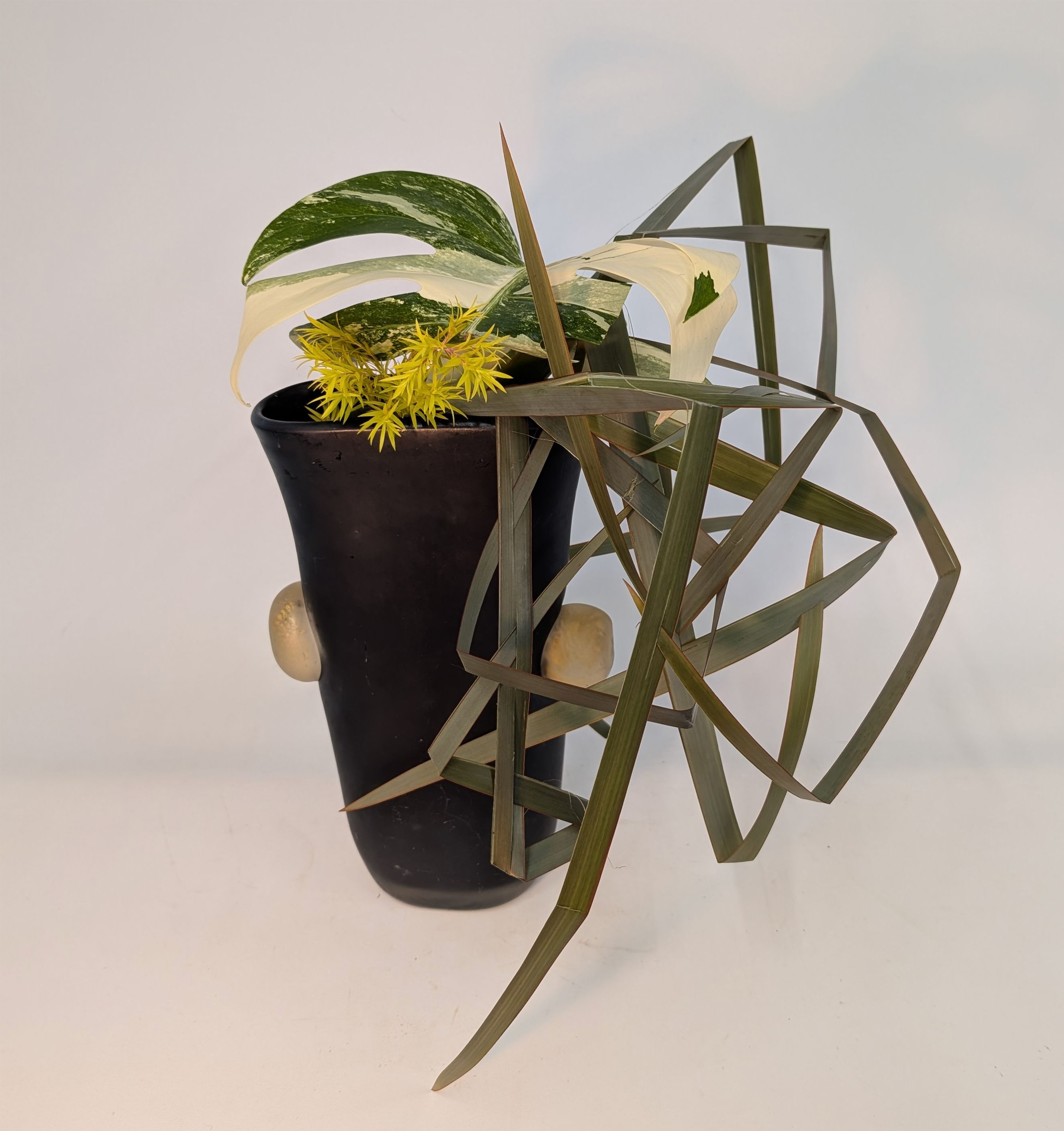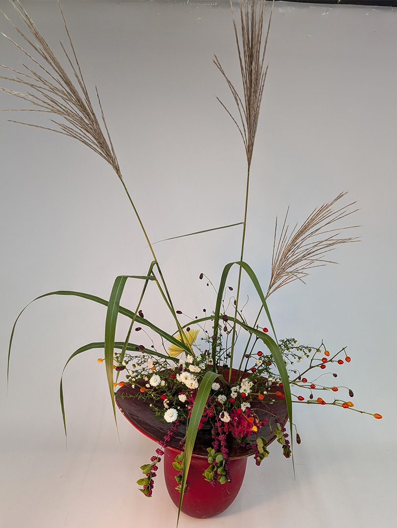 竹中麗湖先生のスタイリッシュ:スペース+花 受講舞台上のインスタレーション始め様々な生け花テクニックを学ぶ 生け花インターナショナルに入会 |